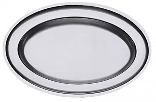2x Bratenplatte, oval aus Edelstahl 18/10, seidenmatt poliert, mit gebördeltem Rand, schwere Qualität, hergestellt auf Original-VDN®-Werkzeugen Länge: 36 cm, Breite: 25 cm, Höhe: 2,7 cm