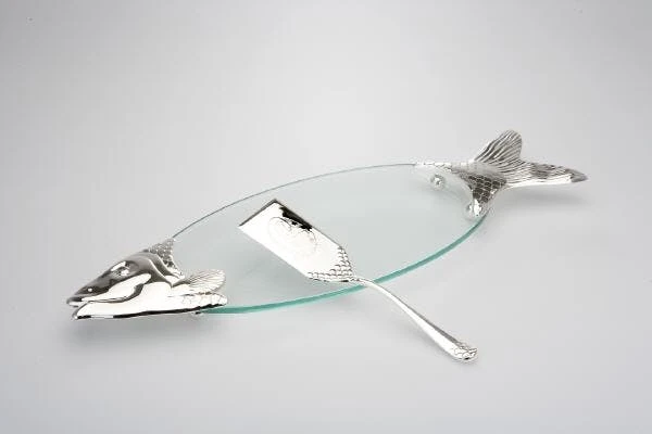 Fischförmige Platte mit ovalem Glaseinsatz, versilbert und anlaufgeschützt. Der Heber ist ebenfalls versilbert. Die Glasplatte ist pflegeleicht, da das Glas trennbar ist. Die Platte hat eine Maße von 58 x 19 cm und der Heber iene Länge von 26 cm.